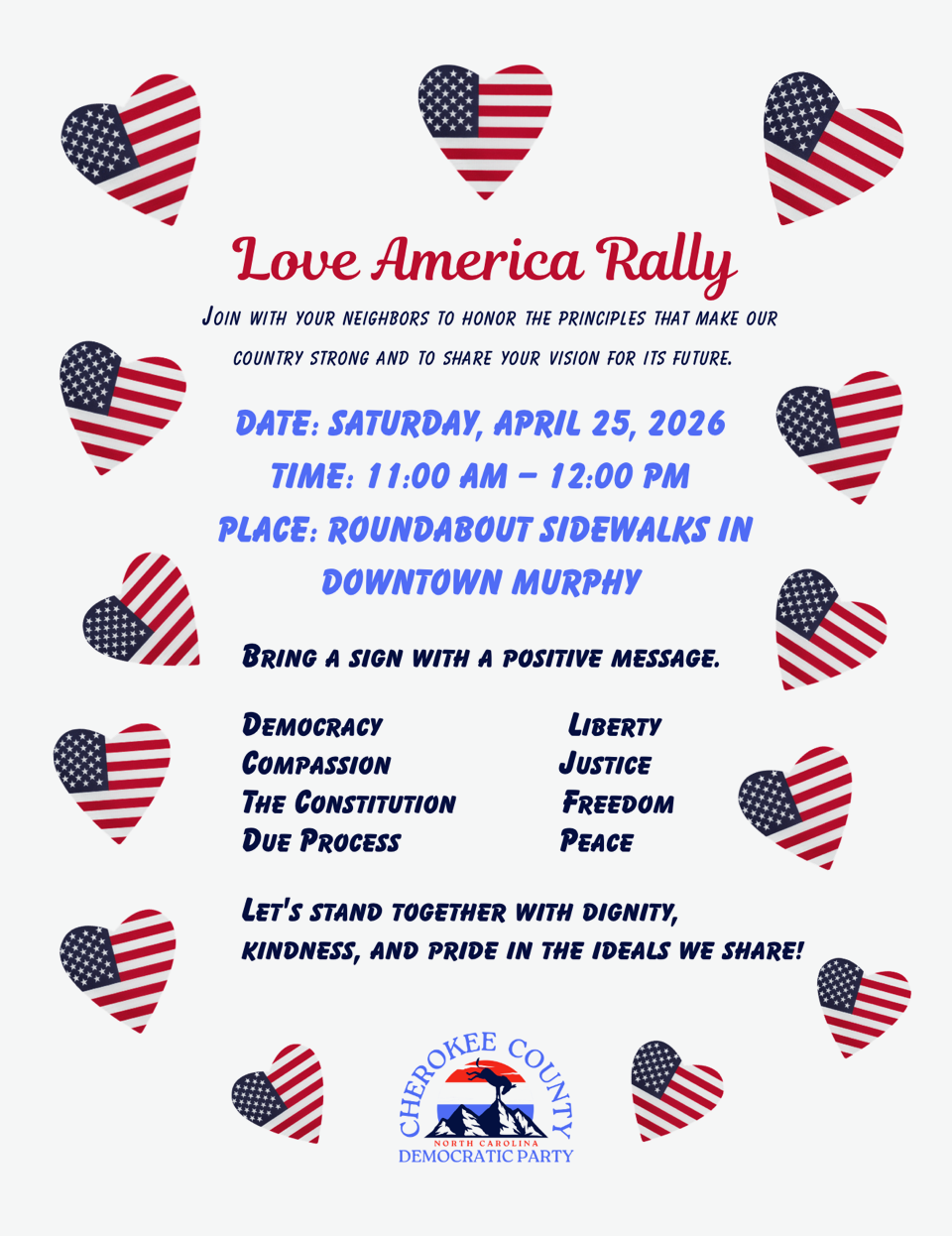 Join area neighbors in Downtown Murphy for a “Love America Rally”… see attached event flyer for details.
